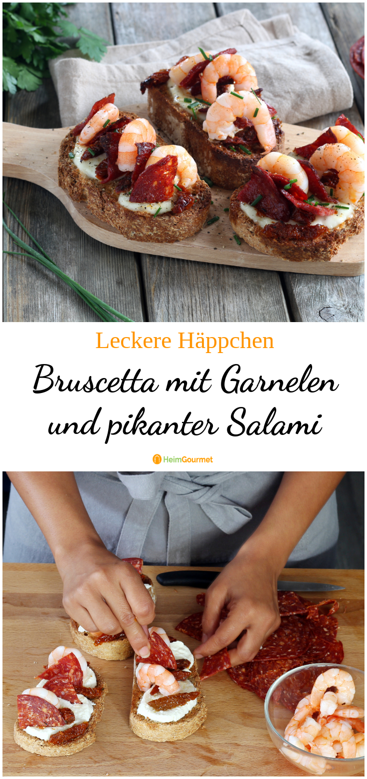 Bruschetta auf Vollkornbrot mit Garnelen und pikanter Salami