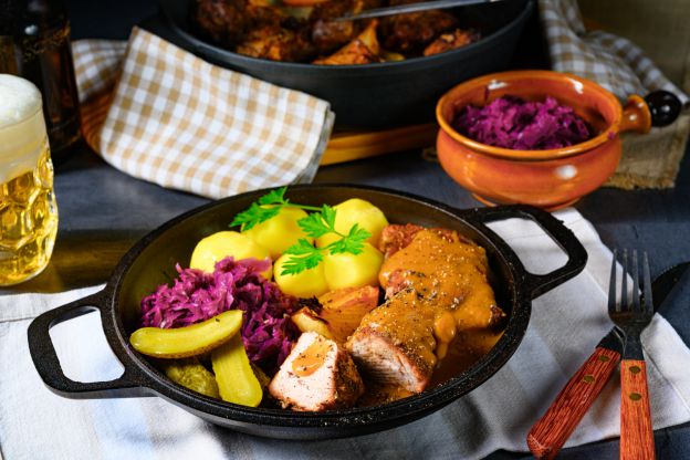 Snirtjebraten oder auch Brutzelbraten ist in ganz Ostfriesland beliebt und wird gerne an Feiertagen oder zu Weihnachten serviert. Dazu gehören Rotkohl, Salzkartoffeln und Gewürzgurken als Beilage.