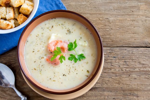Karottensuppe ist ein Klassiker, aber warum nicht einmal diese Selleriesuppe mit Garnelen versuchen.
