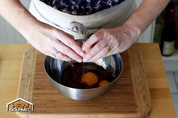 Die 2 Eier aufschlagen und zu der Nutella geben.