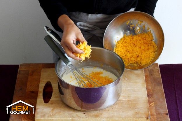 Für die Béchamelsoße die Butter schmelzen, Mehl hinzugeben, kurz andicken lassen und die Milch hinzugießen. Dabei gut rühren, um Klumpen zu vermeiden. Die Soße salzen und pfeffern und mit einer Prise Muskatnuss verfeinern. Die Flüssigkeit zum Kochen bringen und für einige Minuten köcheln lassen. Sobald sie beginnt anzudicken, vom Herd nehmen und den geriebenen Käse hinzufügen.