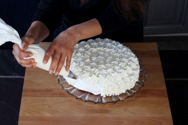 Den Rand der Torte ebenfalls mit Sahnetupfen dekorieren.