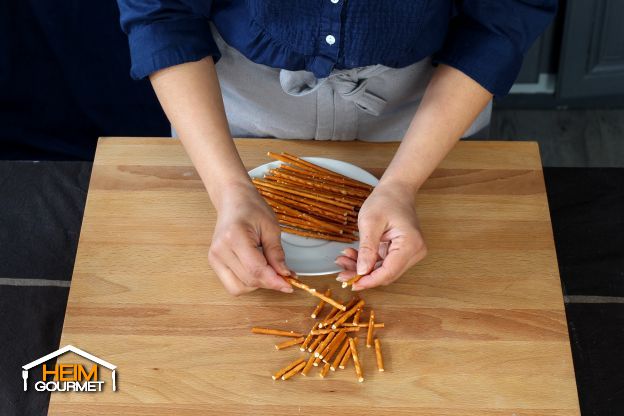 Die Salzstangen jeweils in drei Stücke brechen.
