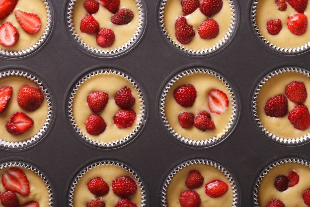 Den Teig zu 3/4 in die Muffinformen füllen. Auf jeden Muffin einige Erdbeerstücke (oder auch ganz Erdbeeren) geben und mit etwas Kristallzucker bestreuen.