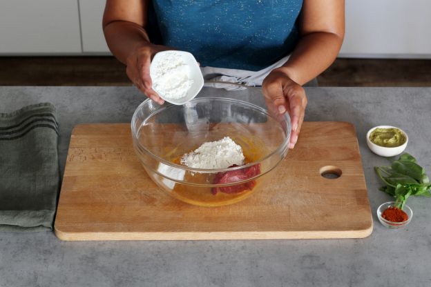 Gebt das Tomatenmark, das Mehl, die Maisstärke und das Backpulver hinzu.