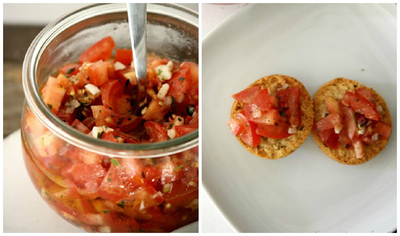 Tomaten und Knoblauch fein würfeln, Kräuter dazu geben, salzen und pfeffern und dann Olivenöl dazugeben. Ich habe das ganze schon am Morgen gemacht, damit es bis zum Abend schön durchziehen konnte.