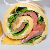Den Quark nun gleichmäßig dünn auf den Pfannkuchen verteilen, Salatblätter draufgeben und mit Räucherlachs bedecken. Dabei am Rand zu einer Seite ca. 2 cm freilassen. Alles aufrollen und mit Küchengarn befestigen.