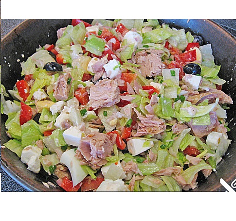 Thunfisch, Eier, Paprika, Tomaten, Schafskäse, Zwiebeln und Eisbergalat zusammen in eine Schüssel geben und verrühren. Das Ganze mit Salz, Pfeffer, Schnittlauch und dem aufgefangenen Thunfischöl abschmecken. Auf Teller anrichten und jeweils 4 Oliven darauf legen.