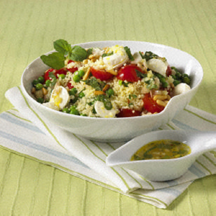 Mozarella in Schreiben schneiden. Couscous mit Tomaten und Erbsen mischen, Mozarelle und Pinienkerne darauf verteilen und mit der Vinaigrette beträufeln. Mit beiseitegelegter Minze garnieren.