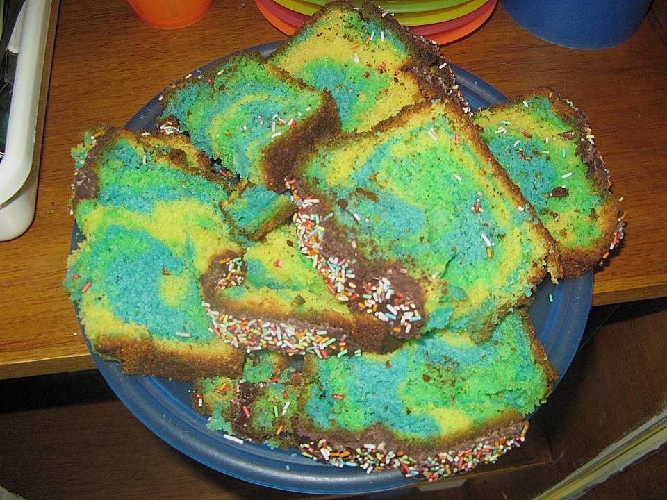 Nun die Backform (Springform, Muffinform oder Kastenform) fetten und dann mit Mehl oder Paniermehl ausstäuben. Danach aus jeder der verschiedenen Farbschüsseln nacheinander immer wieder mit einem Esslöffel mit Teig dazu geben, so dass zum Schluss ein buntgefleckter Teig die Backform füllt.