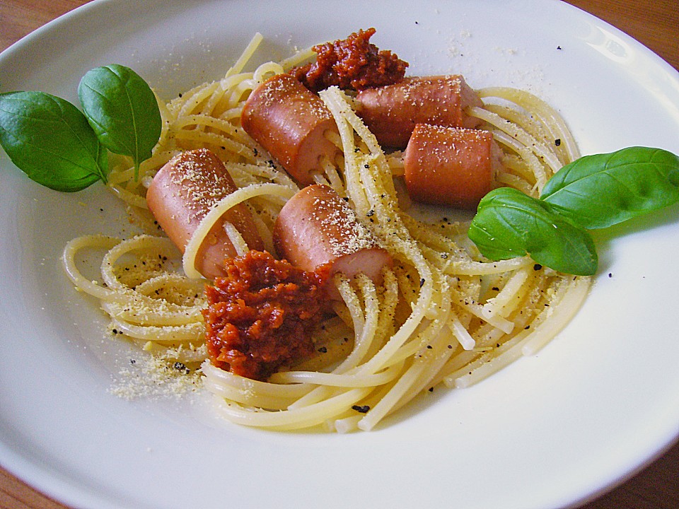 Die Würstchen in etwa fingerdicke Stücke schneiden. Pro Würstchenstück ca. 8 - 10 Spaghetti vorsichtig durchstecken, zur Seite legen.