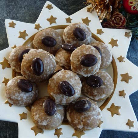 3 El Mokkapulver in heißem Wasser auflösen. Abkühlen lassen, mit Rum und Puderzucker verrühren. Die warmen Plätzchen damit bestreichen und je eine Mokkabohne daraufsetzen.