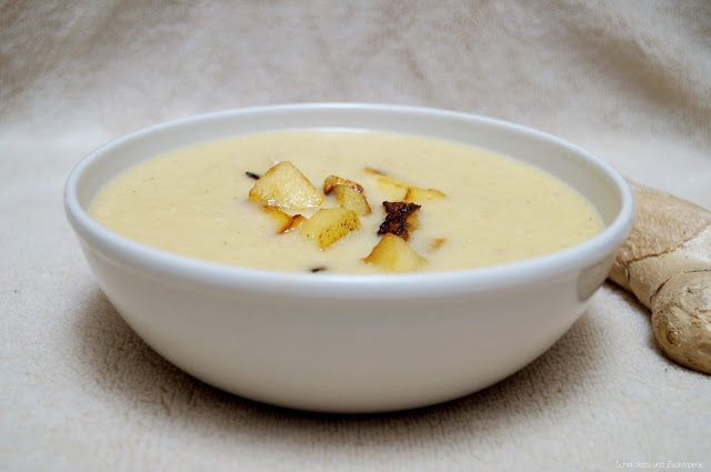 Die restlichen Apfelstückchen in etwas Butter anbraten und die Suppe damit garnieren.