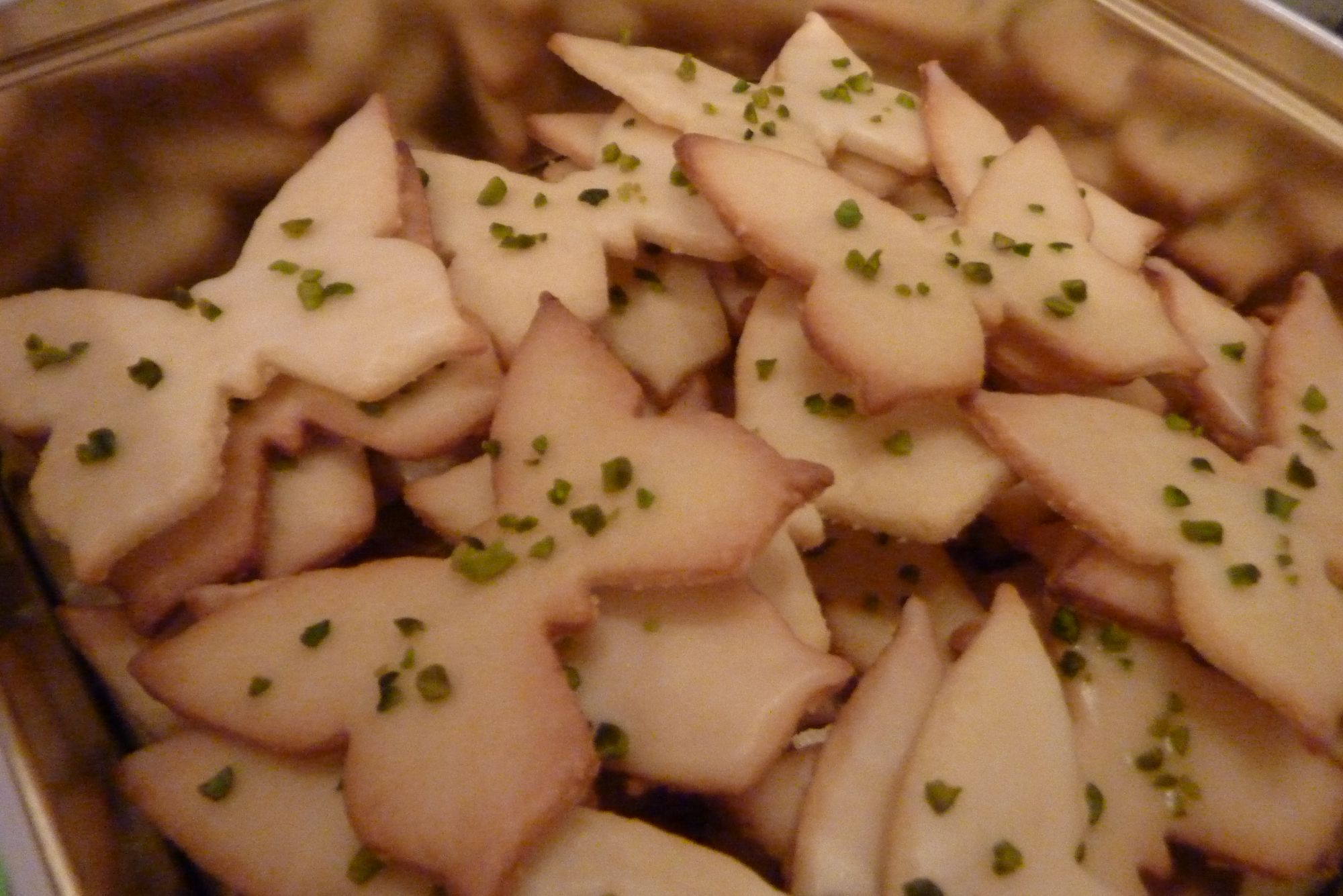 Das Ei trennen. Mehl, Eigelb, Salz, Zitronenabrieb, 1 EL Zitronensaft, die Butter in Flöckchen und 50 g Puderzucker auf der Arbeitsfläche gut durchhacken und schnell zu einem Mürbeteig kneten. Ca. 1 Stunde im Kühlschrank kalt stellen. Den Backofen auf 180° Ober-/Unterhitze vorheizen, Backblech mit Backpapier belegen. Den Teig auf einer bemehlten Arbeitsfläche möglichst dünn ausrollen. Mit einem Ausstecher Schmetterlinge ausstechen, aufs Blech legen und im Ofen 2 Schiene von unten ca.8-9 Min. backen. Anschließend gut auskühlen lassen. Aus den übrigen 100 g Puderzucker, dem Zitronensaft und dem Eiweiß mit dem Handrührgerät einen dicklichen Zuckerguss schlagen. Den Zuckerguss dünn auf die Plätzchen pinseln, mit Pistazien dekorieren und trocknen lassen.