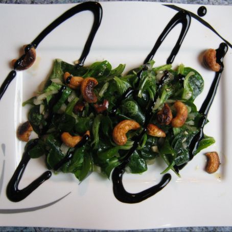 Salat waschen. Zwiebel und Knoblauch schälen und in keine Würfeln schneiden. Zwiebel, Knoblauch in die Salatschüssel geben. Hier Öl und Himbeeressig dazugeben und salzen und pfeffern. Nach Geschmack Maggie dazu, 2 EL Ahornsirup hinzufügen. Sollte das Dressing zu sauer sein, einfach Zucker dazugeben. Cashewkerne kurz anbraten und am Schluß auf den Salat. Wer mag kann den Salat noch mit Schafskäse und Tomaten verfeinern. Am Schluß Balsasmico-Essig als Deko drüber (muß aber nicht)