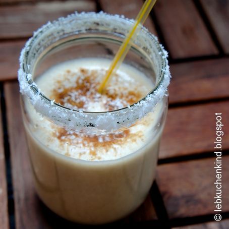 Alle Zutaten in einen Mixer geben und gut durchmixen. Nach Belieben mehr oder weniger Milch dazugeben bis die gewünschte Konsistenz erreicht ist. Zum Verzieren den Rand des Glases zuerst mit etwas Honig, Agavendicksaft oder sonstigem Sirup einreiben und anschließend in Kokosraspel oder Kekskrümel tauchen. Das sieht schön aus und schmeckt vor allem lecker.