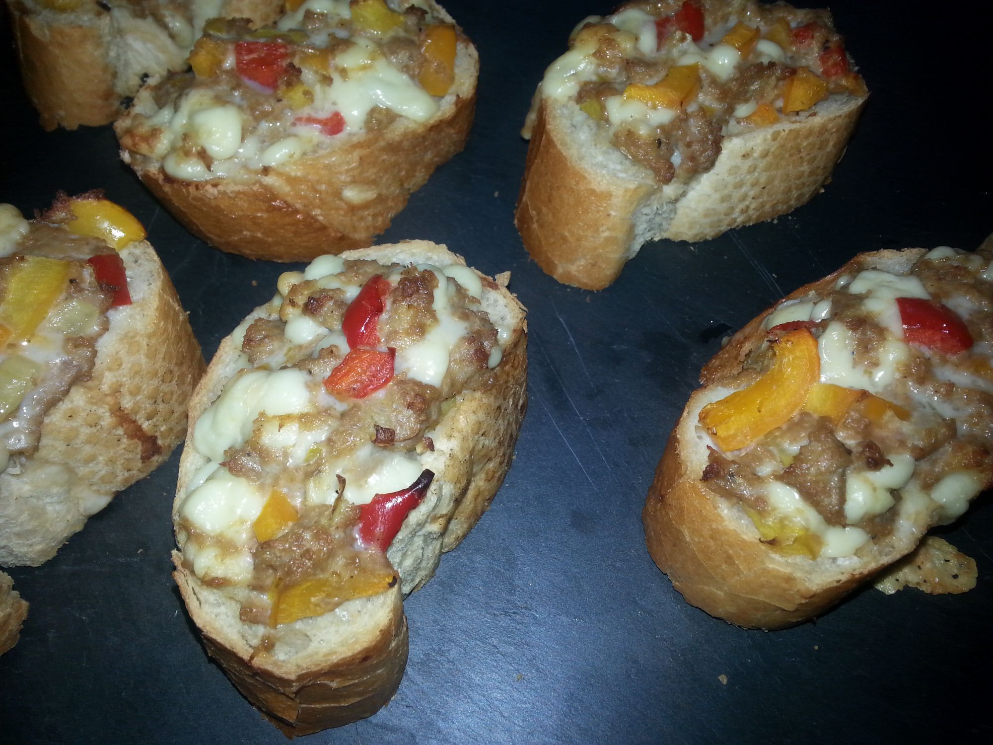 Die Masse etwa einen Finger dick auf die Stangenbrotscheiben geben und bei 175°C Umluft (vorgeheizt) , mittlere Schiene 15 - 20 Minuten backen.