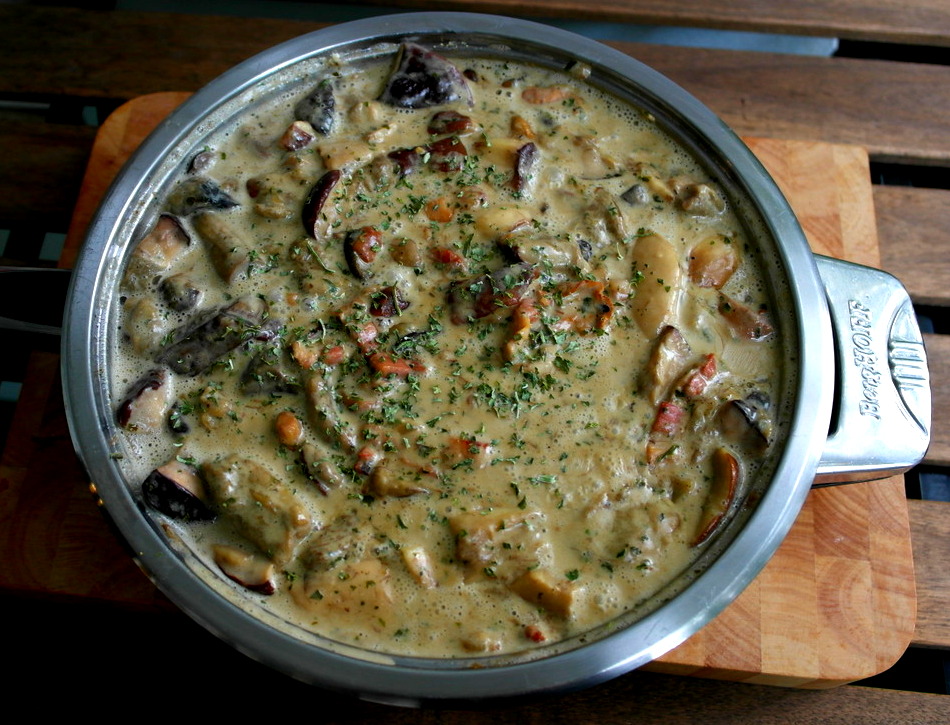 Das Ganze nun bei niedriger Hitze ca. 10-15 Minuten köcheln lassen und fertig ist ein äußerst schmack- und nahrhaftes Gericht - perfekt für die erschöpften Pilzesammler.