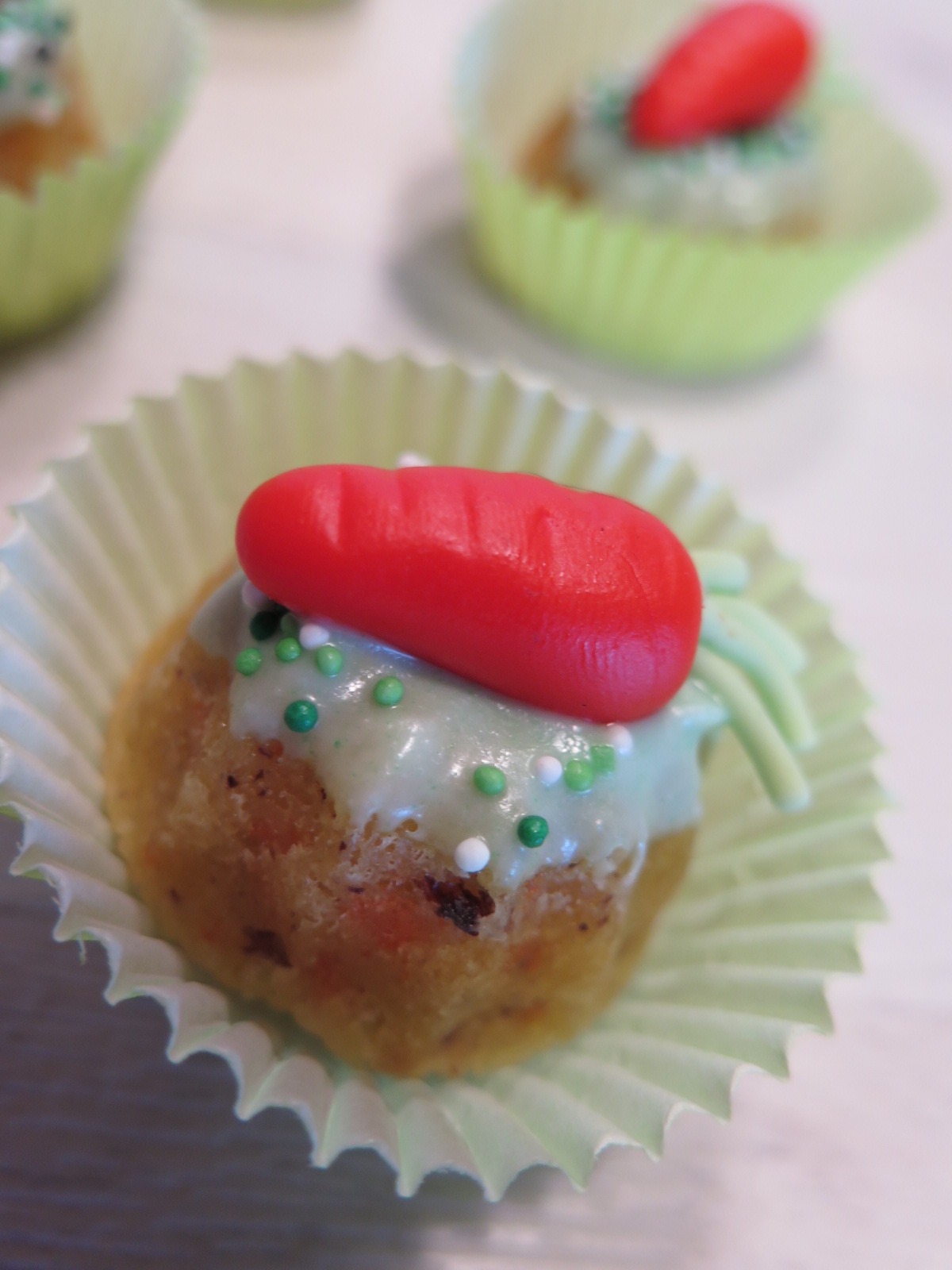 Etwas weiße Kuvertüre vorsichtig in der Mikro schmelzen und mit grüner Lebensmittelfarbe einfärben. Nicht mit jeder Farbe kann Schokolade gefärbt werden! Am besten vorher testen. Mit einigen Zuckerperlen bestreuen und jeweils eine Fondant-Karotte auflegen. Sobald die Deko fest ist in kleine Papiermanschetten setzen und genießen oder verschenken.
