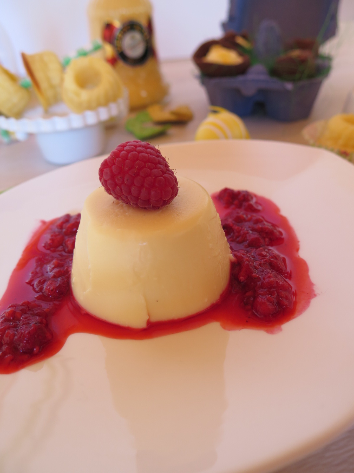 Die Vanilleschote längs aufschlitzen und das Mark herauskratzen. Zusammen mit der Sahne und dem Vanillezucker aufkochen und bei schwacher Hitze ca 15 Minuten köcheln lassen. Die Gelatine nach Packungsanweisung in kaltem Wasser einweichen. Das Panna Cotta vom Herd nehmen und die Schote entfernen. Gelatine einrühren und auflösen lassen. Den Eierlikör unterrühren. Die Förmchen in kalt ausgespülte Förmchen füllen und für min. 3 Std. im Kühlschrank fest werden lassen. Für den Fruchtspiegel die Himbeeren mit dem Puderzucker pürieren. Panna Cotta am Rand mit einem scharfen Messer lösen und die Form kurz in heißes Wasser tauchen. Aus der Form stürzen und zusammen mit dem Fruchtspiegel anrichten.