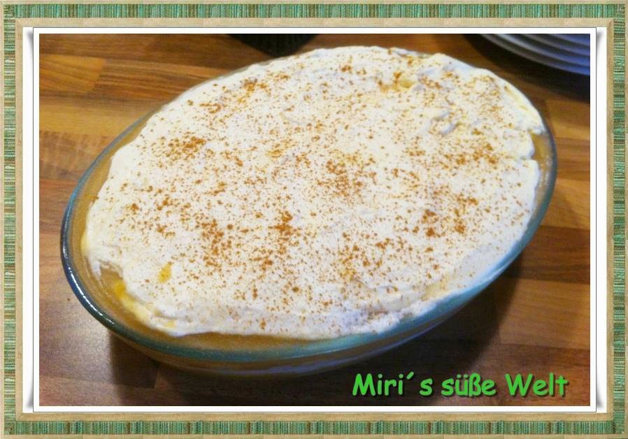 In einer Auflaufform eine Lage Löffelbiskuit auslegen, mit der gezuckerten Seite nach unten und mit etwas Apfelsaft tränken (wer gerne etwas Alkohol dabei hätte kann auch Apfelsaft mit Calvados mischen). Darauf etwas Apfelmus streichen und mit einer Cremeschicht bedecken. Jetzt so weitermachen bis die Form ausgefüllt ist, auf die letzte Cremeschicht streut ihr dann etwas Zimtpulver. Im Kühlschrank ca 2 Stunden kalt stellen.