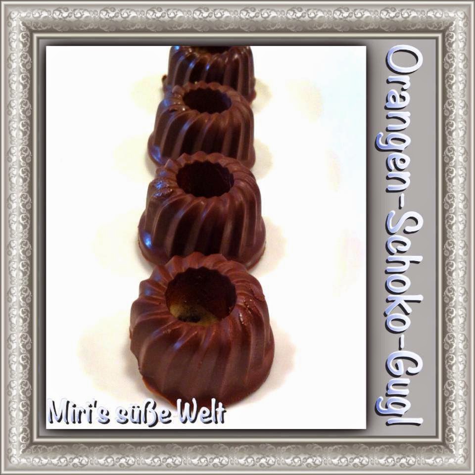 Für den Schokoüberzug Kuvertüre mit etwas Palmin schmelzen und in die Gugl-Förmchen geben, ca 1/3 mit Schokolade füllen. Dann die Gugl wieder zurück in die Formen stecken und das ganze im Kühlschrank aushärten lassen.