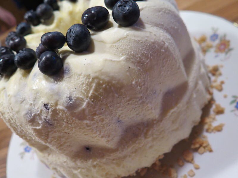 Vanillesahne in eine Gugelhupfform* füllen. Heidelbeerkompott darauf verteilen und mit einem Löffel streifig untermischen (so wie bei einem Marmorkuchen). Den Gugelhupf nun 2 Stunden einfrieren.