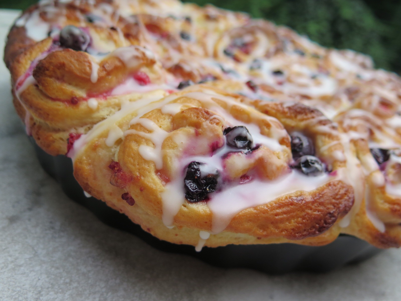 Heidelbeeren (und Johannisbeeren) verlesen und ggf. waschen. Mit der Beerenkonfitüre verrühren. Eine Pieform (26cm) fetten. Teig auf einer bemehlten Arbeitsfläche kurz duchkneten und zu einem Rechteck ausrollen. Die Beerenmischung darauf verteilen, dabei ringsherum einen Rand von ca. 2 cm frei lassen. Teig von der Längsseite her aufrollen und in 10-12 Scheiben schneiden. Teigschnecken nebeneinander aufrecht in die Form setzen und zugedeckt eine Stunde gehen lassen.
