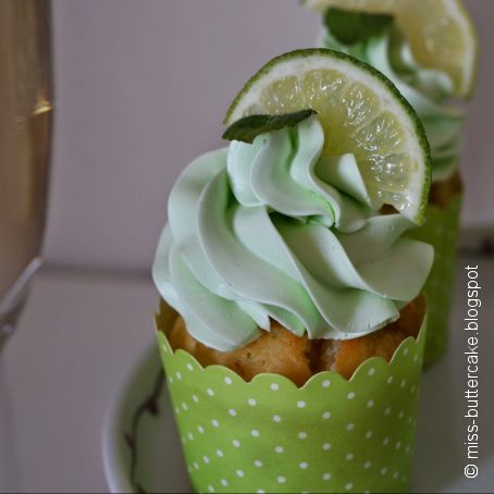Für den Teig werden Zucker und Butter weiß cremig geschlagen. Dann werden die Eier einzeln dazugeben und anschließend die Minze, den Sirup und den Abrieb der Limette. Mehl, Backpulver und Salz in einer extra Schüssel vermischen und abwechselnd mit der Milch und dem Sekt zur Butter-Ei Masse geben. Den Teig in Muffinförmchen füllen und bei 175 °C ca. 25 Minuten backen lassen. Danach gut abkühlen lassen.