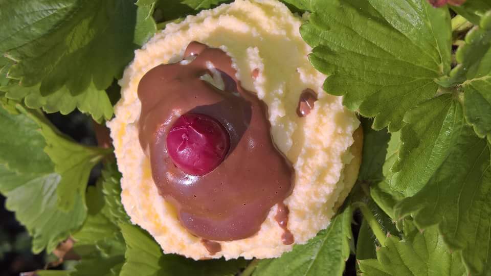 Sahne aufkochen und Schokolade darin auflösen. Abkühlen lassen. Butter cremig rühren und dann Pudding esslöffelweise unterrühren. In Spritzbeutel und Tuffs auf Muffins aufspritzen. Schokolade darüber verteilen und mit einer Kirsche garnieren. In den Kühlschrank für mind. 1 Stunde.