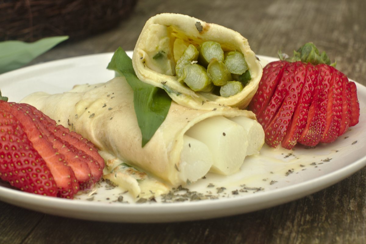 Pfannkuchen auf einen Teller legen, 2-3 Spargelstangen darauf legen, 1-2 EL Sauce Hollandaise darauf geben,
